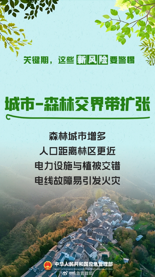 陽春三月,春意盎然。春季氣溫逐漸升高,降水偏少,大風(fēng)天氣增多。伴隨春耕生產(chǎn)、踏青祭祀等生產(chǎn)生活用火增多,森林火災(zāi)風(fēng)險增高。近期,多地陸續(xù)進入春季森林防火關(guān)鍵期,以下新風(fēng)險要警惕!