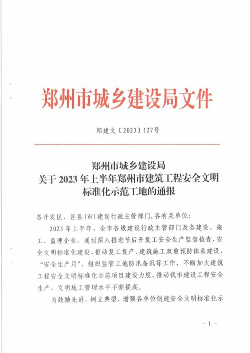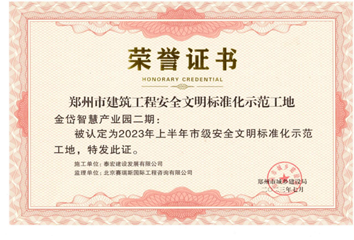 近日,經(jīng)鄭州市城鄉(xiāng)建設(shè)局評選,河南鄭地科創(chuàng)產(chǎn)業(yè)發(fā)展有限公司投資建設(shè)的金岱智慧產(chǎn)業(yè)園二期項目榮獲“2023年上半年鄭州市建筑工程安全文明標準化示范工地”榮譽稱號。