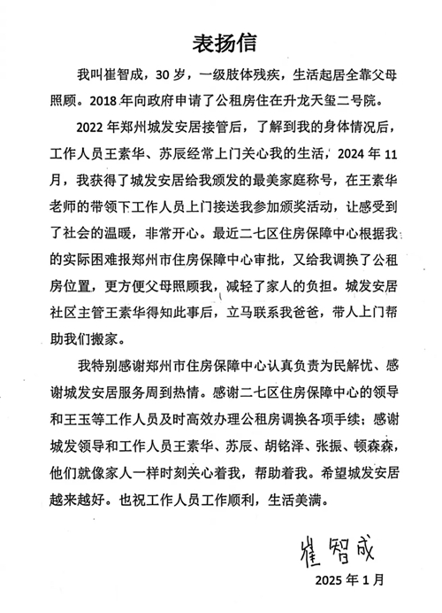 1月9日清晨,崔老師一家分別向住保中心、城發(fā)安居贈送了錦旗,并送來一封表揚(yáng)信,對住保中心所展現(xiàn)的認(rèn)真負(fù)責(zé)態(tài)度以及為民解憂的卓越作風(fēng)表達(dá)了高度贊揚(yáng),同時也對城發(fā)安居工作給予了肯定鼓勵。