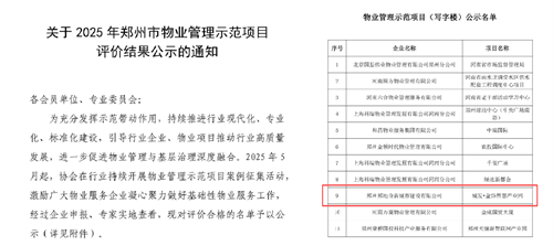 近日,鄭州市物業(yè)管理協(xié)會官網(wǎng)發(fā)布《關于2025年鄭州市物業(yè)管理示范項目評價結(jié)果公示的通知》,城發(fā)·金岱智慧產(chǎn)業(yè)園獲評“鄭州市物業(yè)管理示范項目”。