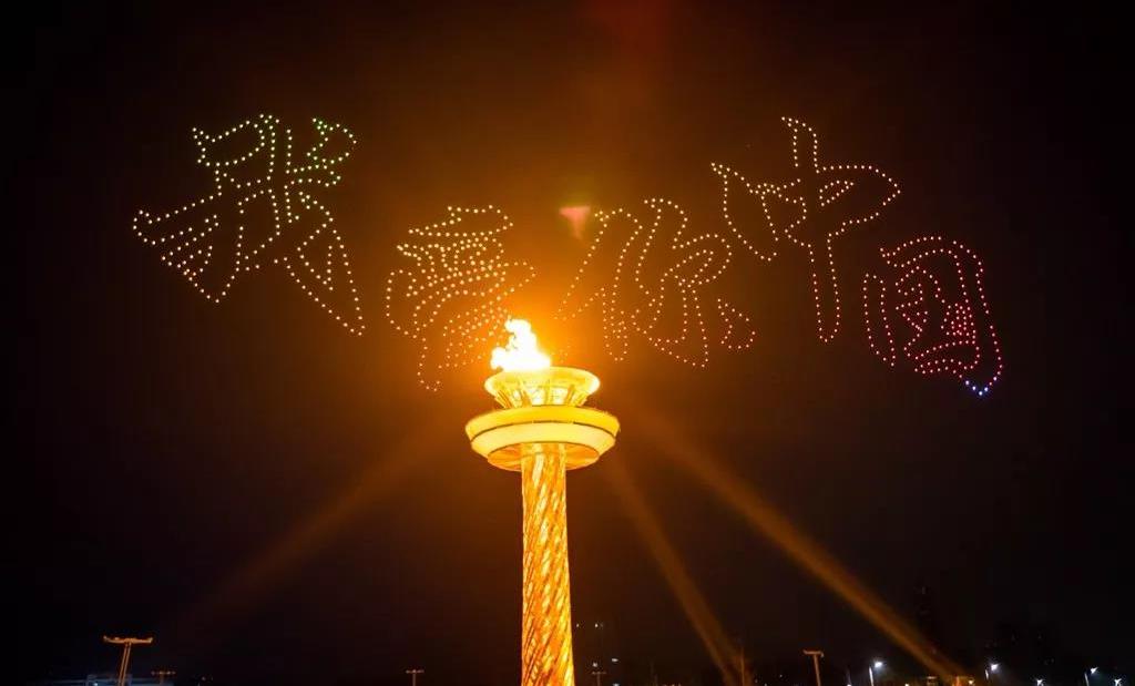 當現(xiàn)場屏幕通過虛擬技術(shù)應(yīng)用,呈現(xiàn)出美麗的畫面,讓現(xiàn)場觀眾仿佛置身北國北川、南嶺飛瀑之中,觀眾都情不自禁地揮舞起了手中的國旗為他們的表演喝彩!為我們偉大的祖國喝彩!1000架無人機從奧體中心廣場升起迅速變換成中中的造型,點燃民族運動會的火炬。