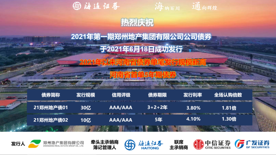 鄭州地產集團始終堅守“讓城市更美麗,讓生活更美好”的初心使命,始終堅持黨建引領業(yè)務相向而行、雙促雙融,著力保障省市重點項目建設資金。集團融資管理黨支部在黨史學習教育期間,在河南省發(fā)改委、市發(fā)改委的政策指導下,攜手海通證券、中信證券、廣發(fā)證券等金融機構構建黨建聯(lián)建機制,組織黨員深入學習河南革命的艱辛歷程和歷史意義,倡導各方黨員結合崗位實際弘揚“奮斗”的革命精神,助推本期債券成功發(fā)行。未來鄭州地產集團仍將秉承國企擔當,以服務實體經濟、彰顯區(qū)域發(fā)展為己任,履行城市建設者、城市運營商的社會責任,持續(xù)為推動鄭州國家中心城市高質量建設賦能添彩!