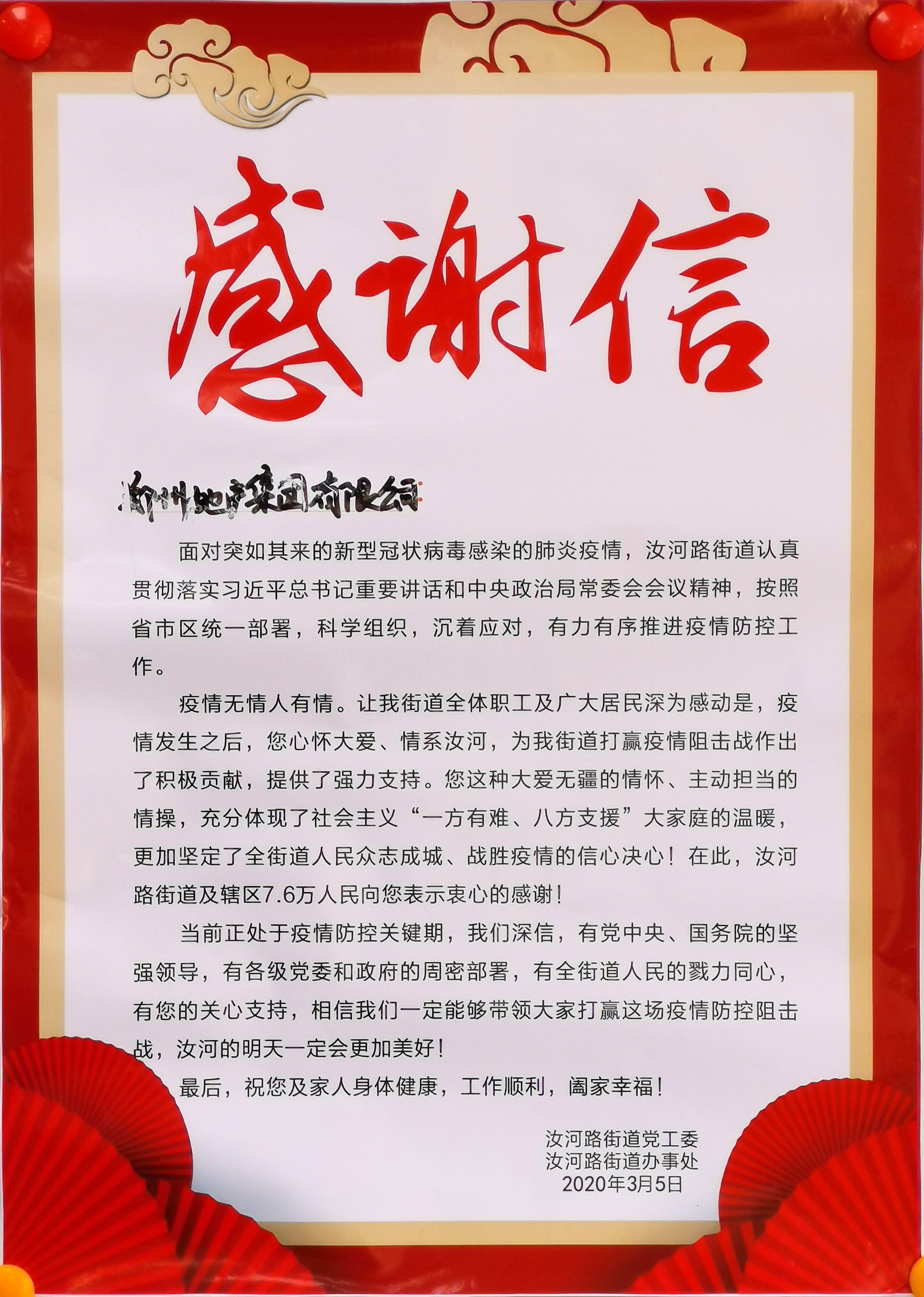 桐淮社區(qū)書記王輝代表社區(qū)工作人員和志愿者向集團(tuán)領(lǐng)導(dǎo)送上《感謝信》,并表示集團(tuán)的慰問讓一線工作人員心里充滿了溫暖,也進(jìn)一步堅(jiān)定了開展疫情防控的信心和決心。在地產(chǎn)集團(tuán)等社會(huì)各界的關(guān)心關(guān)注下,在無數(shù)雷鋒式志愿者的共同努力下,我們一定會(huì)打贏新冠肺炎疫情防控這場硬仗。