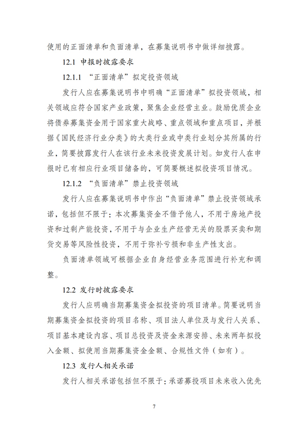 (二)申報材料應明確債券募集資金禁止投向領域,形成“負面清單”。“負面清單”包括但不限于:將募集資金借予他人,用于房地產(chǎn)投資和過剩產(chǎn)能投資,用于與企業(yè)生產(chǎn)經(jīng)營無關的股票買賣和期貨交易等風險性投資,用于彌補虧損和非生產(chǎn)性支出。“負面清單”領域可根據(jù)企業(yè)自身經(jīng)營業(yè)務范圍進行補充和調(diào)整。